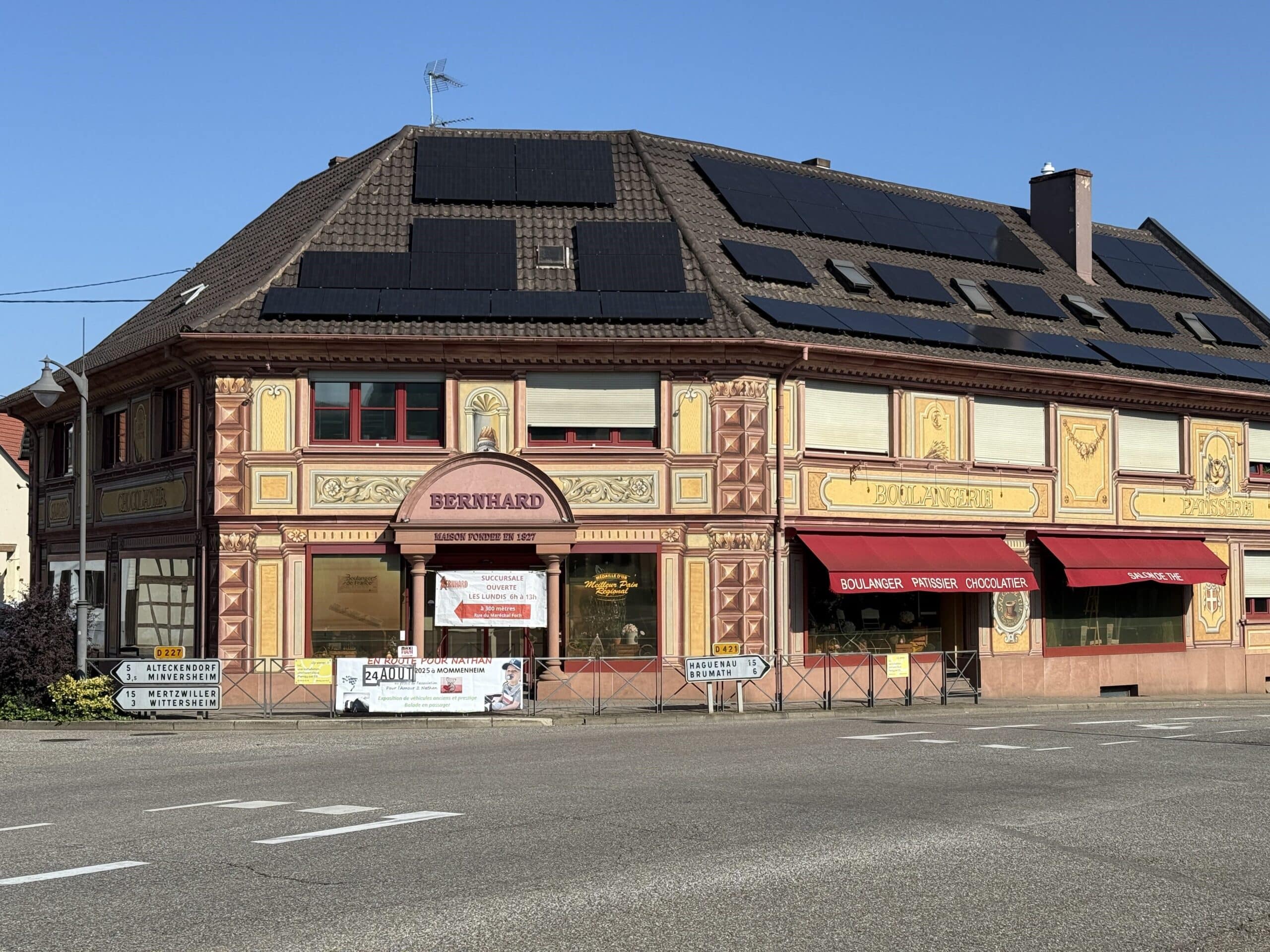 La boulangerie BERNHARD située à Mommenheim a fait le choix du photovoltaïque en installant 103 panneaux sur ses toitures, soit une puissance de 51 kWc. La production attendue est de 51 000 kWh d’électricité par an et sera intégralement consommée par la boulangerie.